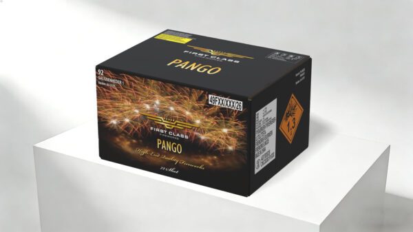 Pango indeholder den bedste kvalitet af guld, som er hentet fra det professionelle sortiment. Samtidig er kaliberen på 30mm den højest tilladte og hvert skud er loaded helt op til grænsen af det tilladte. Tempoet er heftigt og batteriet er dermed noget af det tætteste, du kommer på professionelt fyrværkeri. Den enorme finale afskyder 450g ren krudt på én gang. Vi er derfor trygge ved, at du med Pango kan afslutte dit show med den kraftigste guldfinale i området.